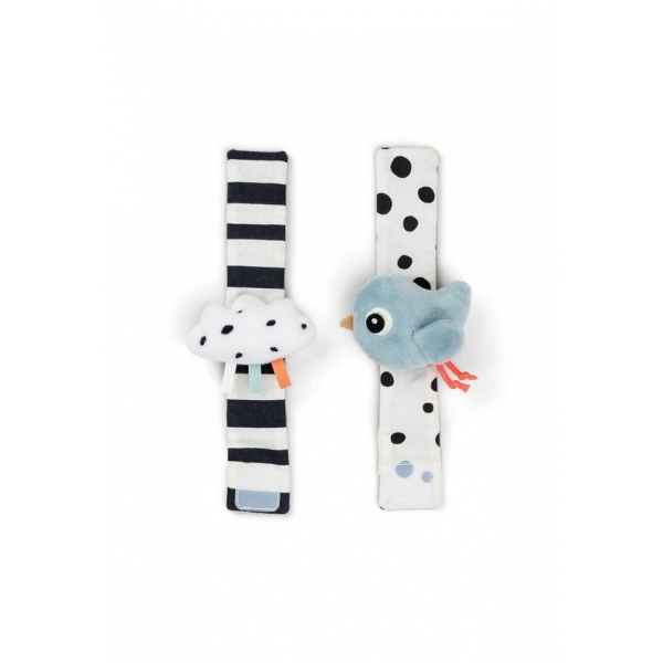 Kontrastingos dėmės kartu su spalvingomis detalėmis suteikia vizualinę stimuliaciją, o barškėjimo ir girgždėjimo garsai patraukia vaiko dėmesį. Viename barškutyje pavaizduotas BIRDEE, o kitame – obuolys, todėl galima žaisti įvairiai. Rinkinys, pritaikytas tiek riešams, tiek kulkšnims, leidžia kūdikiui laisvai judėti, o BIRDEE motyvuoja tyrinėti ir judėti.