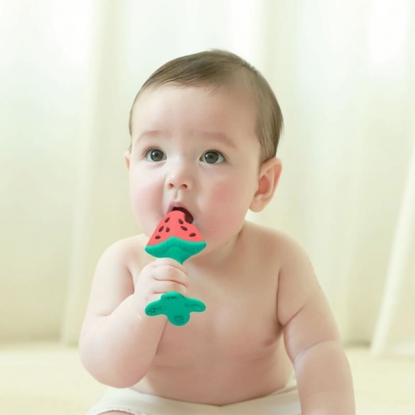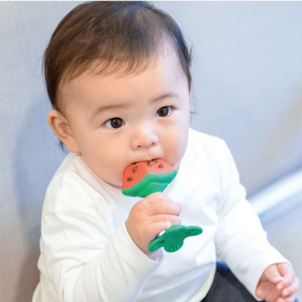 Patrauklus ir realistiškas arbūzo dizainas skirtas mažų burnyčių ir rankyčių tyrinėjimams.3 skirtingo kietumo kramtuko tekstūros ramina, masažuoja ir stimuliuoja perštinčias kūdikio dantenas dantukų dygimo periodu.