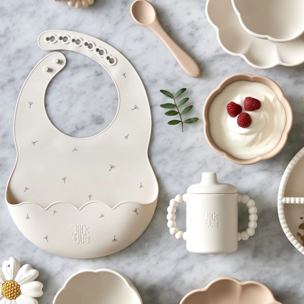 JACK O JUNO silikoninis valgymo indelių komplektas LITTLE POPY CREAM