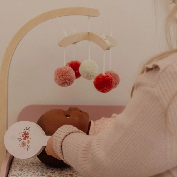 Šis gražus lėlės vystymo stalas turi viską, ko reikia norint su meile rūpintis savo lėle tarsi tikru kūdikiu. Rinkinį sudaro: mobilusis telefonas, nuostabiai minkštas vystymo kilimėlis su svajingu gėlių raštu ir įvairūs mediniai priežiūros reikmenys. Be to, vystymo stale yra sauskelnės, smėlinukas ir dvi mielos drabužių pakabos, kad tvarkingai laikytumėte lėlės drabužius. Spintelė suteikia papildomos vietos visiems reikalingiems daiktams laikyti, užtikrinant, kad jūsų lėlė visada būtų gerai prižiūrima.