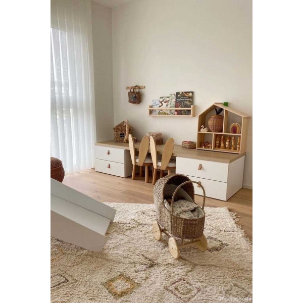 Stačiakampis minkštos medvilnės kilimas su natūralios spalvos pagrindu ir raštais atskleidžia savo žavesį elegantiškų alyvuogių, medaus, dirvos ir kitų atspalvių žaismu. Kilimo kraštus puošia dailūs kutai. Šis kilimas itin tiks vaiko (tiek berniuko, tiek mergaitės) miegamajame arba svetainėje ir suteiks ypatingą įspūdį. Kilimas yra visiškai saugus mažiesiems, nes jo gamybai naudojami tik natūralūs dažai. Jis lengvas, minkštas ir lankstus, pagamintas iš natūralios medvilnės. Rankų darbo kilimas yra unikalus ir originalus.