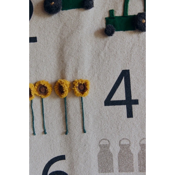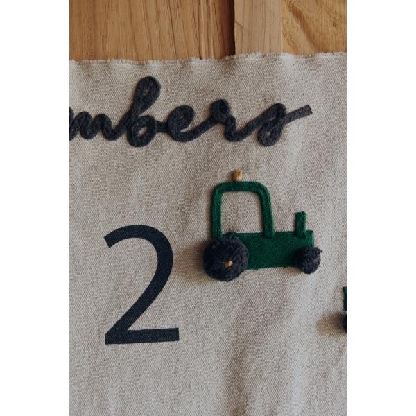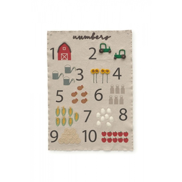 Pasiruoškite mokytis skaičių su šiuo smagiu sieniniu fermos žaidimu! Šis medvilninis sieninis žaidimas yra VINTAGE NUDE atspalvio, tad puikiai derės interjere ir papuoš kambarį. Jis pagamintas iš natūralios drobės, puoštas ūkio tematikos objektais ir skaičiais nuo 1 iki 10. Su tokiomis detalėmis kaip audinys, virvės ir kutai, išnyrantys iš drobės, šis kūrinys yra ir edukacinis, ir dekoratyvus.
