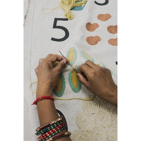 Jis demonstruoja unikalų rankų darbo technikų derinį, sukuriantį tą firminį LORENA CANALS įvaizdį – siuvinėjimą, raštus, rankų darbo bumbulus, pagal užsakymą sumaišytas virveles ir mini kiaušinius. Tikrai vienetinis kūrinys.