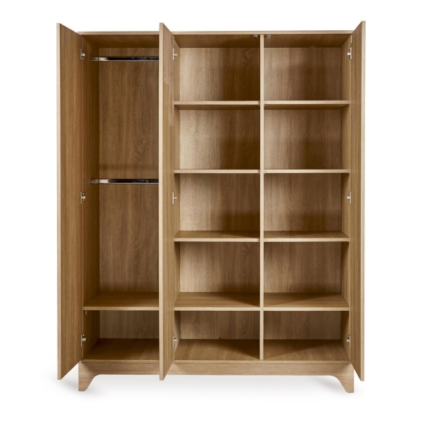 TSUGI XL spinta derina elegantišką dizainą ir praktišką funkcionalumą. Trys varstomos durys turi paslėptas rankenas ir atidarymo stumiant sistemą, kuri sukuria ramų, minimalistinį vaizdą ir yra lengvai naudojamas. Viduje šešios reguliuojamo aukščio lentynos ir du pakabos bėgeliai puikiai tinka drabužiams ir aksesuarams laikyti.