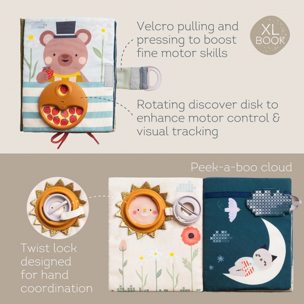 Viduje rasite net 15 įvairių interaktyvių veiklų: užtrauktukus, sagas, raištelius, sagteles ir linksmą „ku-kū“ žaidimą, padedantį stiprinti smulkiąją motoriką.Dėl savo nedidelio dydžio ir lengvumo knygelė puikiai tinka kelionėms – ją patogu pasiimti tiek į ilgą išvyką, tiek į trumpą apsipirkimą.